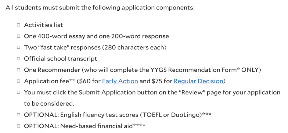 活动列表、2篇文书、2个问答、成绩单、1封推荐信、托福或多邻国成绩(optional)