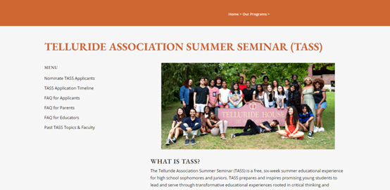 TASS的参与者将体验大学级别的、以讨论为基础的学术研讨会,培养批判性的阅读和写作技巧,并探索民主社区生活的原则和实践。项目强调团队的讨论,而不是讲座式的灌输,鼓动学生对知识的好奇心和积极性。