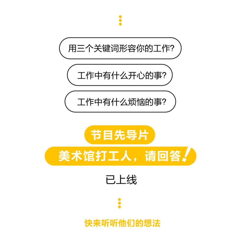 第一期对话聚焦“美术馆打工人”,通过馆长、HR、资深员工以及相关文艺从业者的分享,为大家逐步揭开美术馆工作的面纱;通过内部人士的聊天局,为大家打破行业的求职信息差,共同探讨当今就业浪潮之下美术馆乃至艺术行业的求职情况,以及如何去平衡工作与热爱?希望能引起热爱艺术的你的一些共鸣或思考!