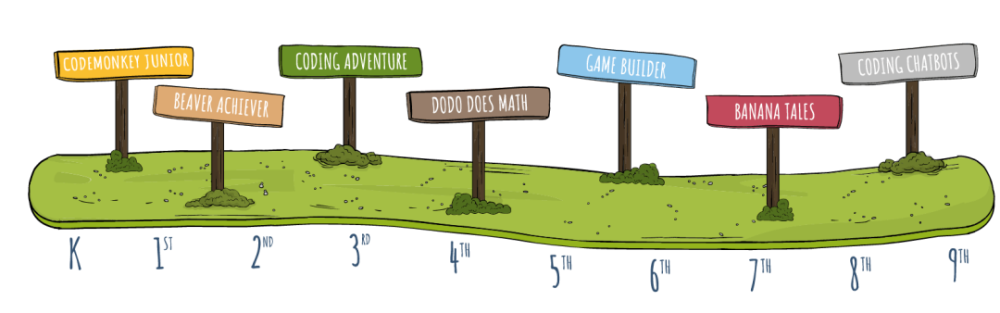 CodeMonkey 目前拥有超过1000个学习关卡,7个主题课程,分别对应幼儿园(K)到9年级(初三)。