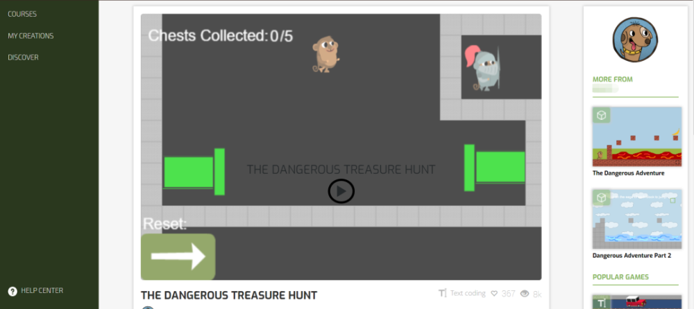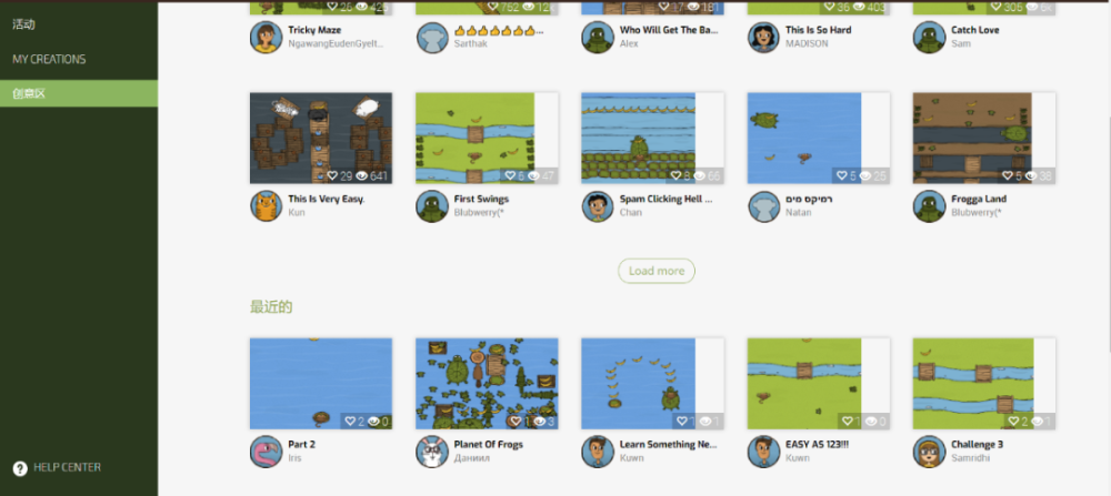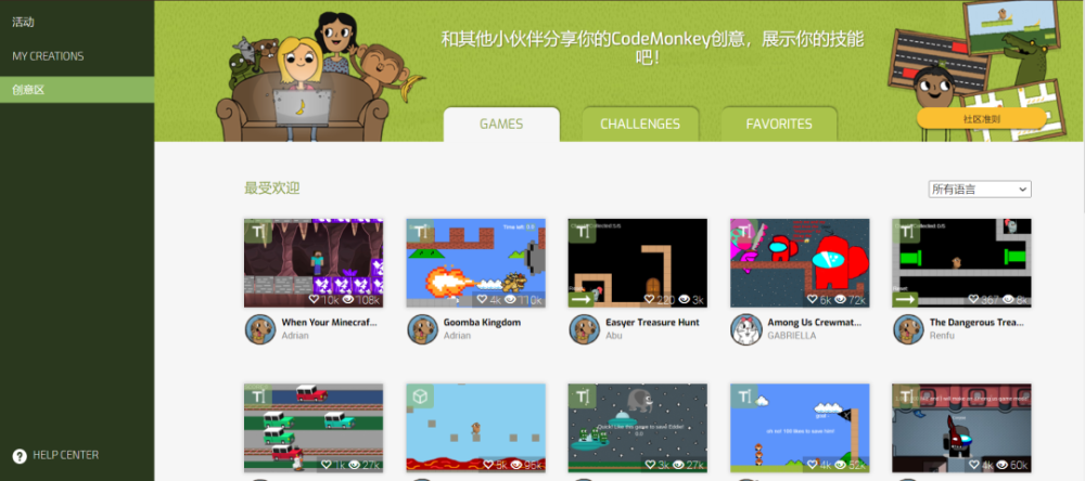 CodeMonkey 还有一个专门的创意社区,上面有其他孩子通过CodeMonkey创造的游戏和关卡,供别人游玩挑战。