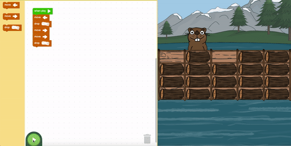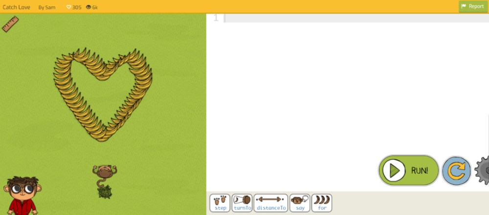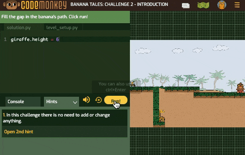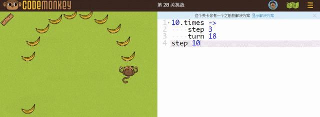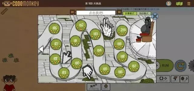 CodeMonkey 的关卡中涵盖编程领域内的绝大部分概念和知识,包括变量、对象、函数调用、参数、循环等。早期关卡非常简单,只需按提示帮助猴子吃到香蕉。