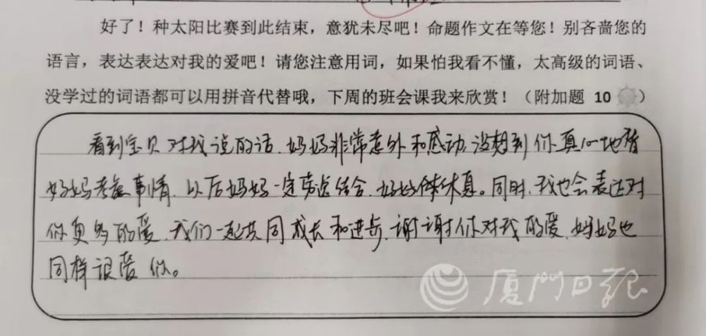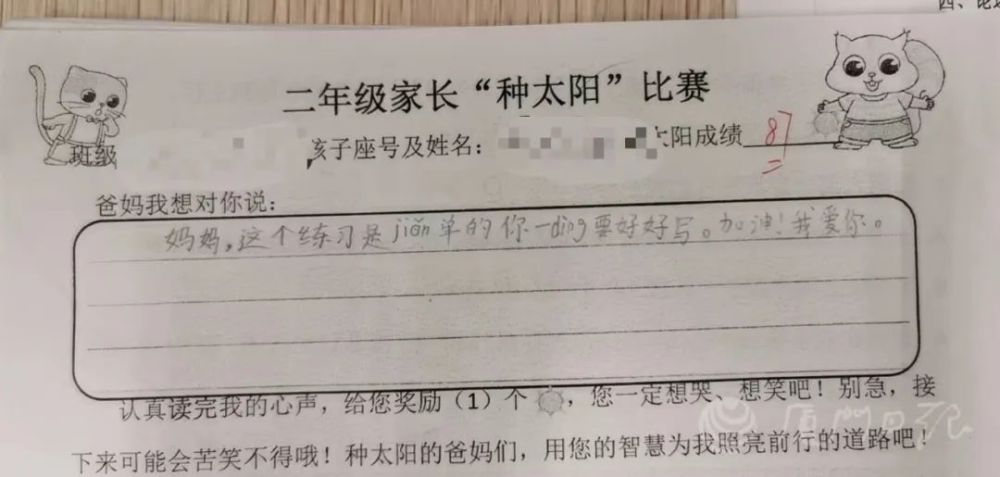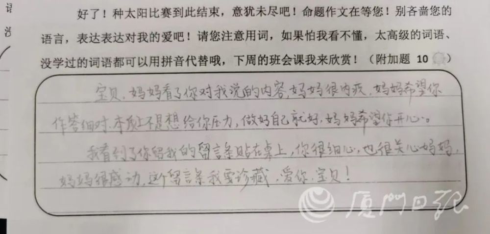 妈妈看了,也写了留言,大意是,看了孩子说的话,自己很内疚。她解释道:妈妈希望你作答细对,本质上不是想给你压力,做好自己就好。