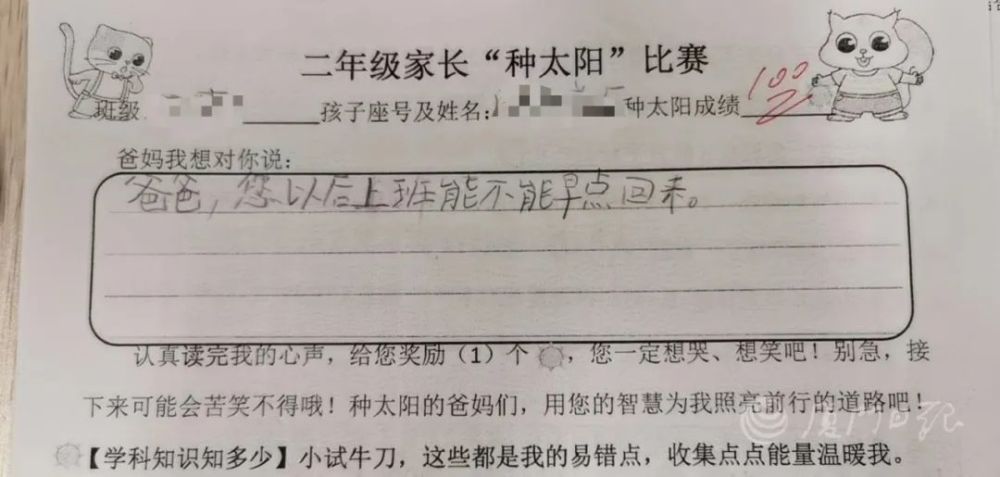 让父母给孩子写一段话,背后的意图也很明显:读完孩子给家长的“童言童语”,还以父母的“真情实意”。五缘实验学校的老师说,妈妈的唠叨,爸爸的严厉,或许是父母表达爱的独有方式。但是,孩子也许还感受不到,处于“直观”年纪的孩子,也许一句“我爱你”,会让他真切地感受到父母的爱有多深。