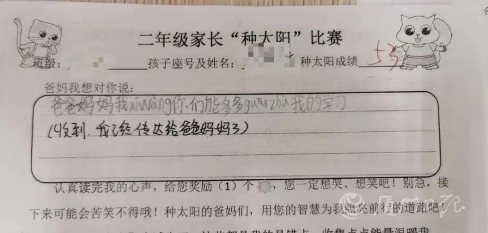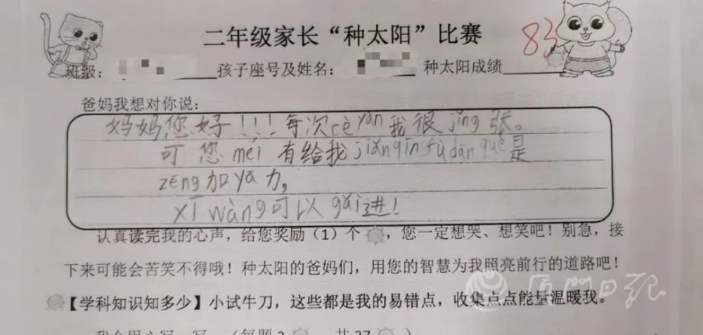孩子写道:每次测验我都很紧张,可您没有给我减轻负担,却是增加压力,希望可以改进哦。