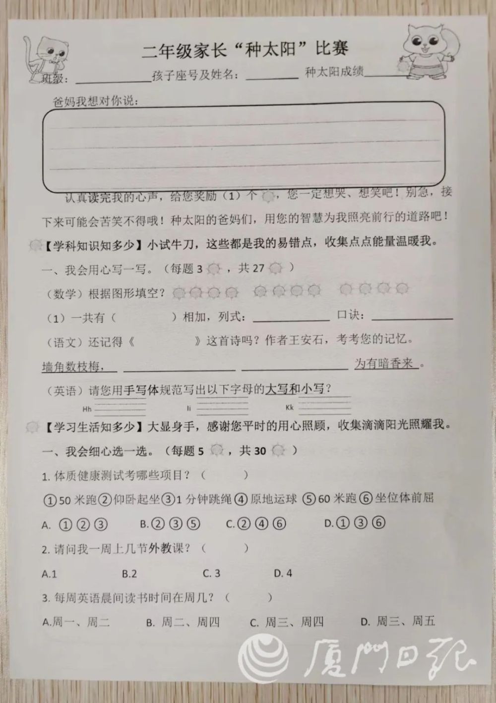 五缘实验学校二年级段长傅芳证实了此事,但她说,我们不叫考试,叫“种太阳比赛”——父母们是种太阳的人。