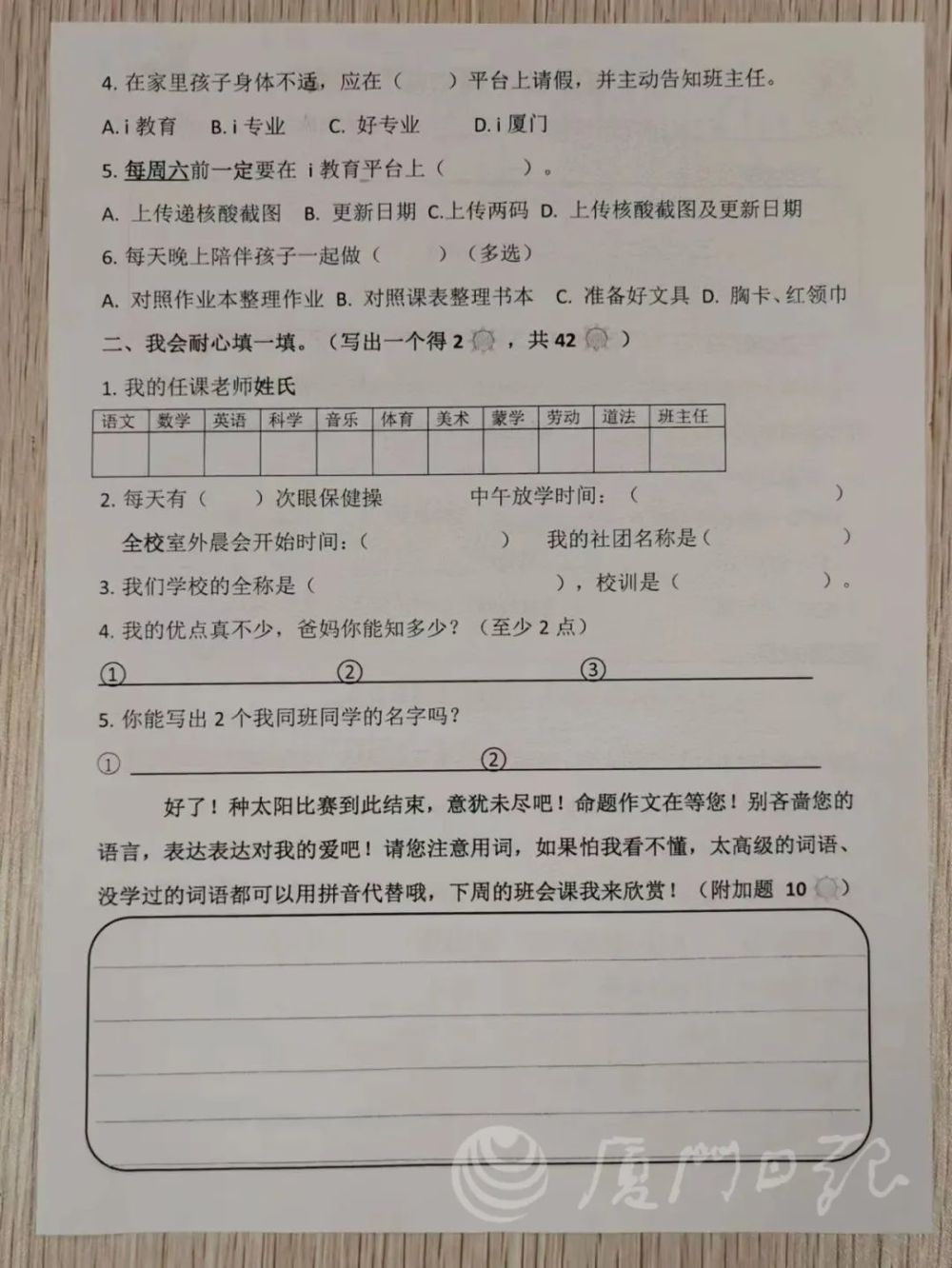 厦门这所学校一些家长要参加期中考!来看看你能得几分?