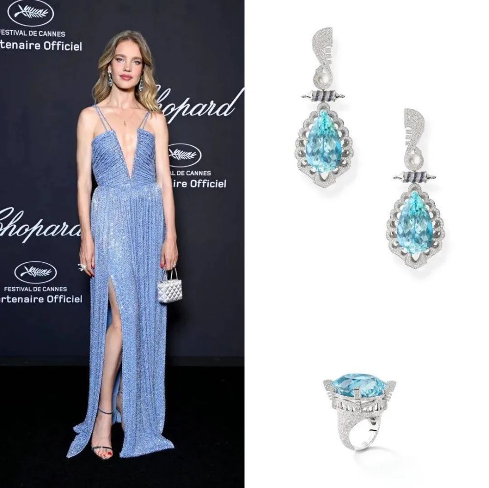 佩戴的珠宝更是和这条裙子相得益彰,梨形切割海蓝宝石耳环,搭配镶嵌了一颗57.55克拉椭圆形切割海蓝宝石的戒指,梦幻又剔透,均来自萧邦Red Carpet系列。
