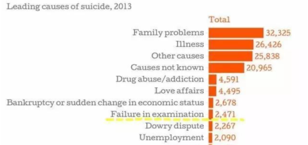 18-29岁的印度年轻人自杀率居全世界前列。考试失败是最重要的原因之一,尤其是高考失败。仅2013年,就有2471人因考试失败而自杀。