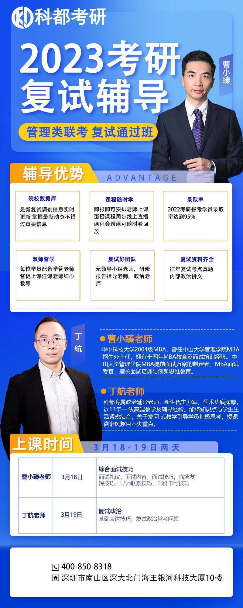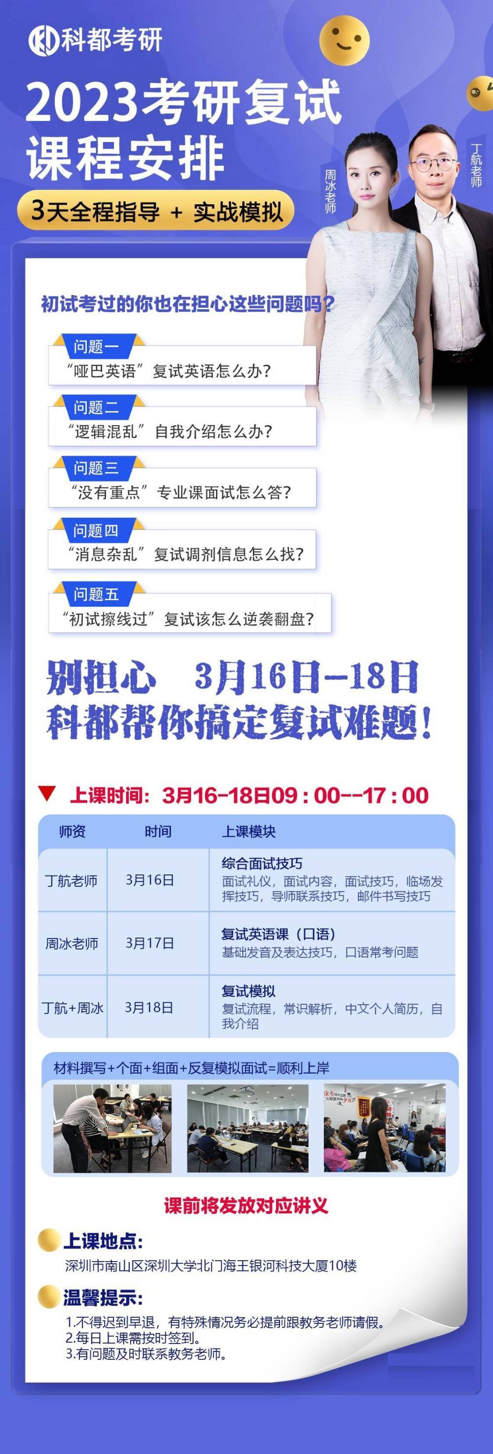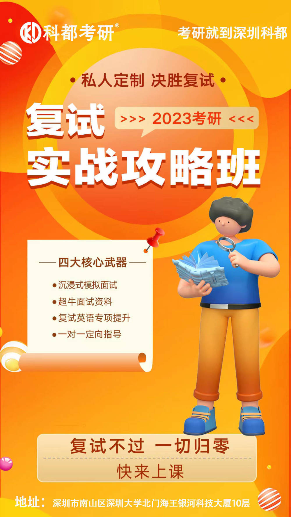 科都教育诚信可靠、扎根深圳多年,有着丰富的考研辅导经验,历年来不断进步、不断的改进,引进丰富的教学资源,是深圳考研行业中值得信任的一家考研辅导机构。如果您正巧有需要考研复试这方面的辅导,欢迎随时点击我们的科都考研网站在线沟通或者直接来电咨询,我们会根据你的现阶段给你推荐合适的复试技巧,助你成功考研!