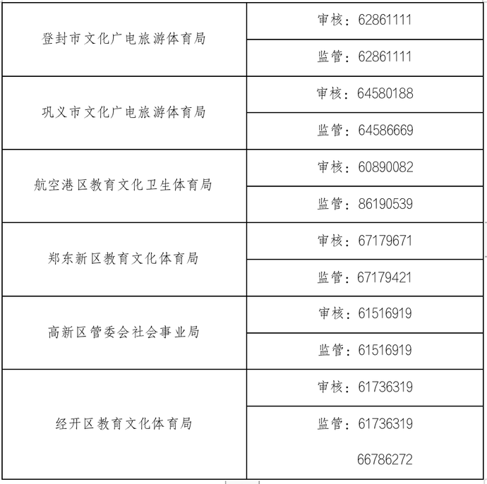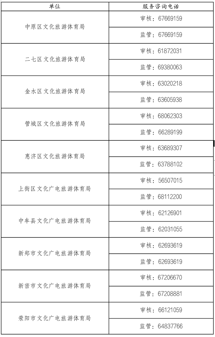 郑州市各开发区、区县(市)体育主管部门服务咨询电话
