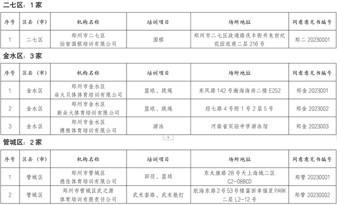 7月5日,记者从郑州市体育局获悉,为严格落实国家“双减”政策,根据《河南省体育类校外培训机构设置标准和管理指南(试行)》和《郑州市体育类校外培训机构设置标准和管理指南(试行)》通知要求,经各开发区和区县(市)体育主管部门审核同意,截至6月30日,共有39家体育类校外培训机构取得线下培训资质,现正式面向社会发布(详见附表)。