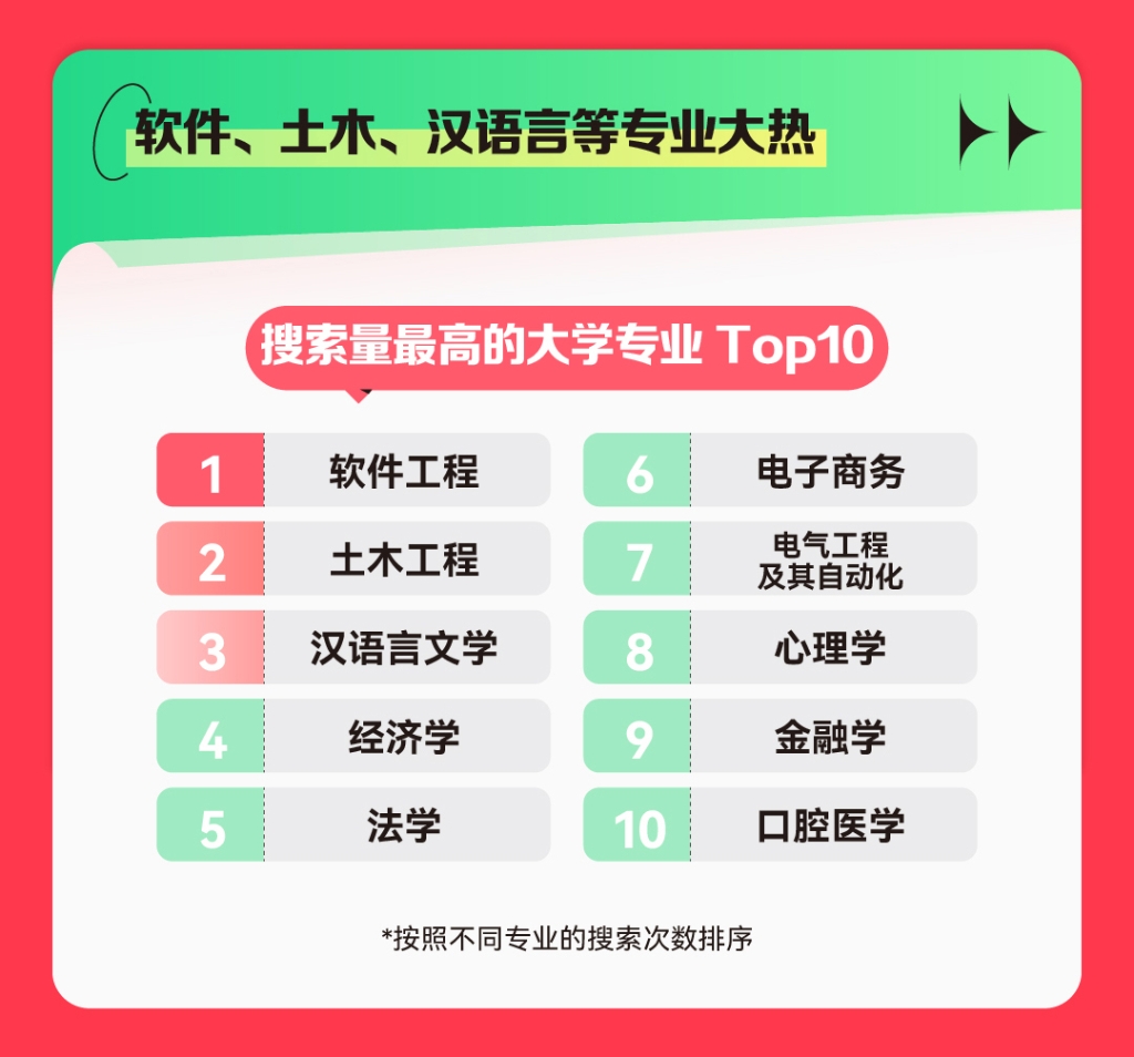 报告显示,理科生志愿问询需求量更大,快手搜索量前十的大学专业依次为软件工程、土木工程、汉语言文学、经济学、法学、电子商务、电气工程及其自动化、心理学、金融学、口腔医学。