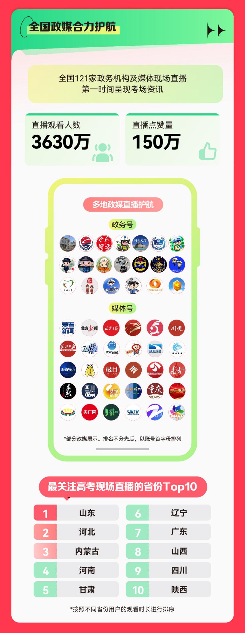 6月7日至6月9日,快手还联动全国121家政务机构及媒体进行直播,在全国各地直击高考现场、呈现考场资讯。该系列直播观看人数达3630万,并收获了超150万点赞。