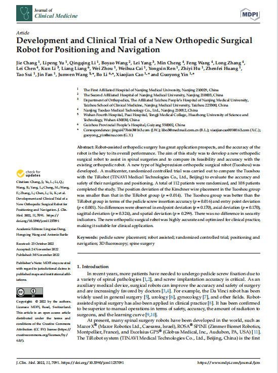 近日,由南京医科大学第一附属医院(江苏省人民医院)、贵州省人民医院、华中科技大学同济医学院附属普爱医院(武汉市第四医院)联合佗道医疗科技有限公司(以下简称“佗道医疗”)共同研究的成果,在国际SCI期刊《Journal of Clinical Medicine》发表。本次研究旨在开发一种新型的骨科手术机器人来辅助脊柱手术,并将其可行性和准确性与现有的骨科机器人的进行比较。经过临床实验证明,该骨科手术机器人具有很高的精度,同时优化了临床操作,适用于临床应用,为骨科医生持续赋能,为智能骨科注入新力量。