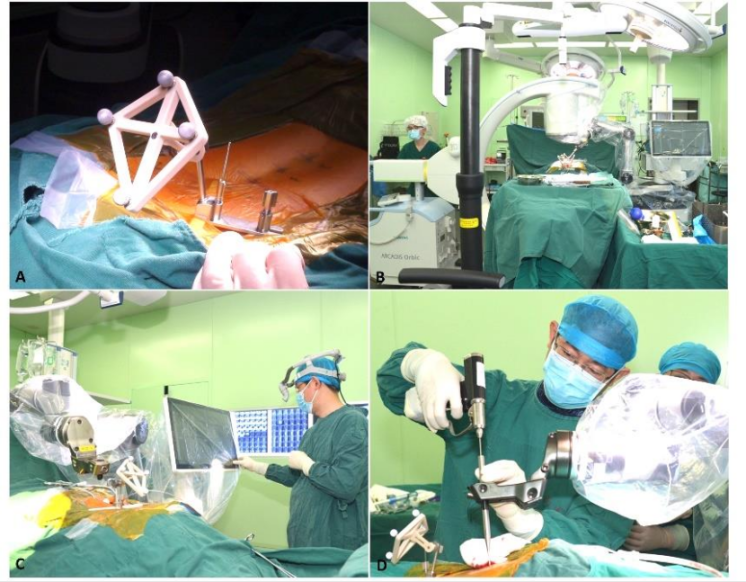 近年来,由于多种脊柱病理,越来越多的患者需要进行椎弓根螺钉固定,而螺钉植入的准确性至关重要。手术机器人作为一种辅助医疗器械,可以提高手术的准确性和安全性,越来越受到医生的青睐。机器人辅助脊柱手术也已应用于临床实践中。它在安全性、准确性、对外科医生的辐射量和学习曲线等方面都已被证实优于手工手术。目前,世界上已经开发了许多脊柱手术机器人,如MazorX,ROSA和Excelsius GPS。现有骨科手术机器人都由类似的组成结构,有一个具有跟踪能力的机械臂,可与术中三维影像导航系统相结合。在获取图像并规划所需的螺钉轨迹后,机械臂可运动至规划位置,为医生指明螺钉的位置和方向,之后由医生手动进行钻孔和螺钉植入。然而,现有骨科手术机器人也有一些缺点,包括由其跟踪器造成的创伤,以及略微复杂的操作程序。因此,我们的团队独立开发了一种新型的骨科机器人(佗手,佗道医疗科技有限公司,南京,中国)来应对现有机器人面临的挑战。