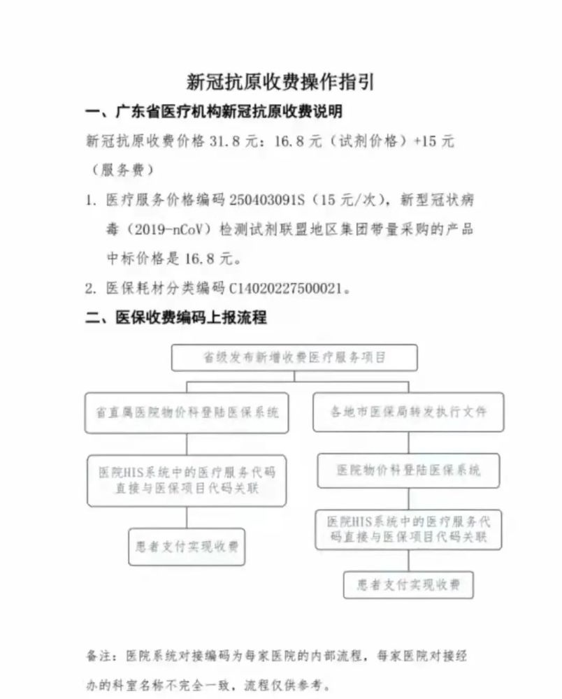 此前,广东省曾发布新冠抗原收费操作指引,新冠抗原收费价格31.8元,其中试剂价格16.8元,服务费15元。