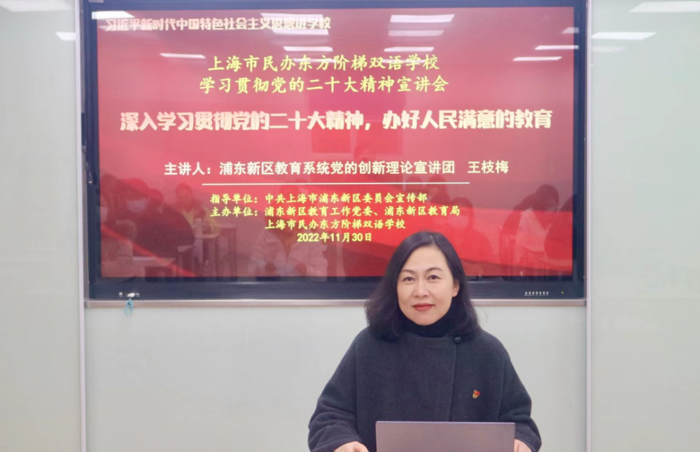 11月30日,民办东方阶梯双语学校诚邀浦东新区教育系统党的创新理论宣讲团成员、上海浦东新区民办正达外国语小学党支部书记王枝梅进行党的二十大精神主题宣讲。学校全体党员、团员教师和行政人员参会。