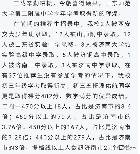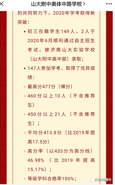 很多人对这所私立学校并不了解,说实话主要原因在位置在化纤厂路,校舍一般,但是近年来的成绩非常不错,在历下区名列前茅,450分以上比率25%,460以上9.35%,当然了一直精耕细作,学生人数不多,四个班吧?