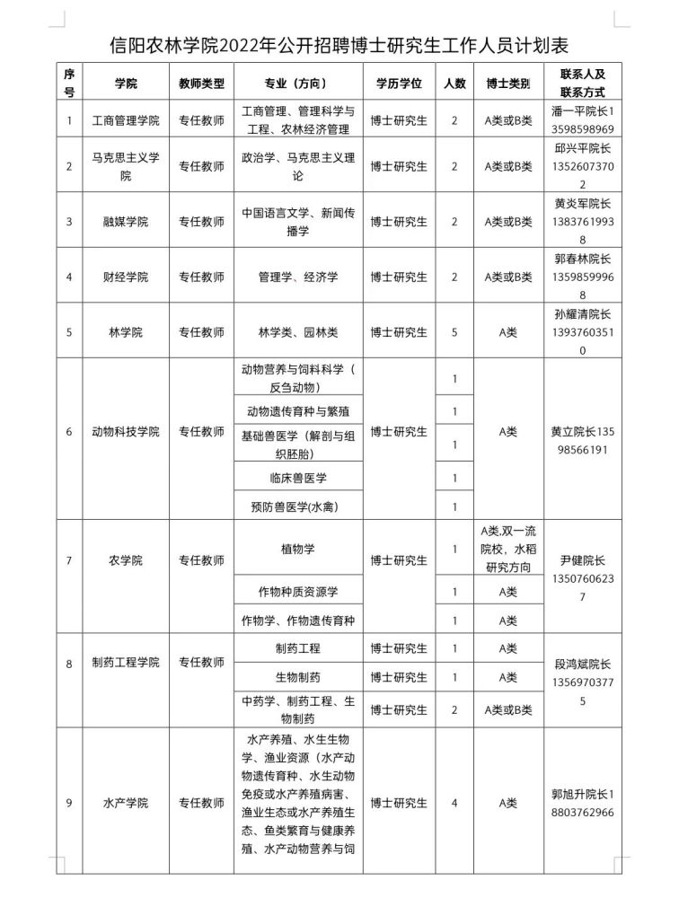 详见《信阳农林学院2022年公开招聘博士研究生工作人员计划表》(附件1)