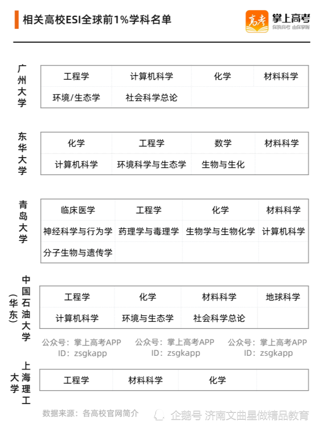 在高校已公开的信息中,部分高校未明确说明入选情况,故暂未统计。在已明确说明入选情况的高校中,青岛大学的临床医学、工程学、化学、材料科学等9个学科入选ESI全球前1%学科,东华大学的化学、工程学、数学等7个学科入选ESI全球前1%学科,中国石油大学(华东)的工程学、化学、材料科学等7个学科入选ESI全球前1%学科。