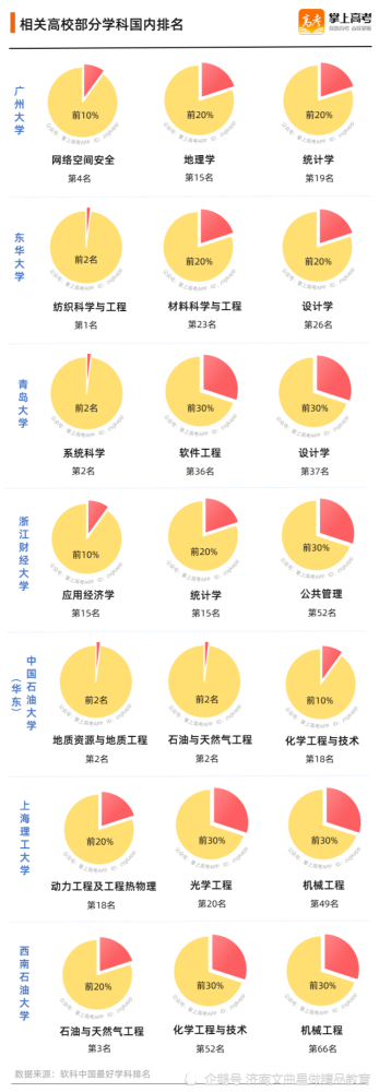 其次是在国内高校的学科排行榜中,广州大学的网络空间安全排名全国第4,东华大学的纺织科学与工程排名全国第1,青岛大学的系统科学位列全国第2,中国石油大学(华东)的地质资源与地质工程、石油与天然气工程位列全国第2,西南石油大学的石油与天然气工程位列全国第3。