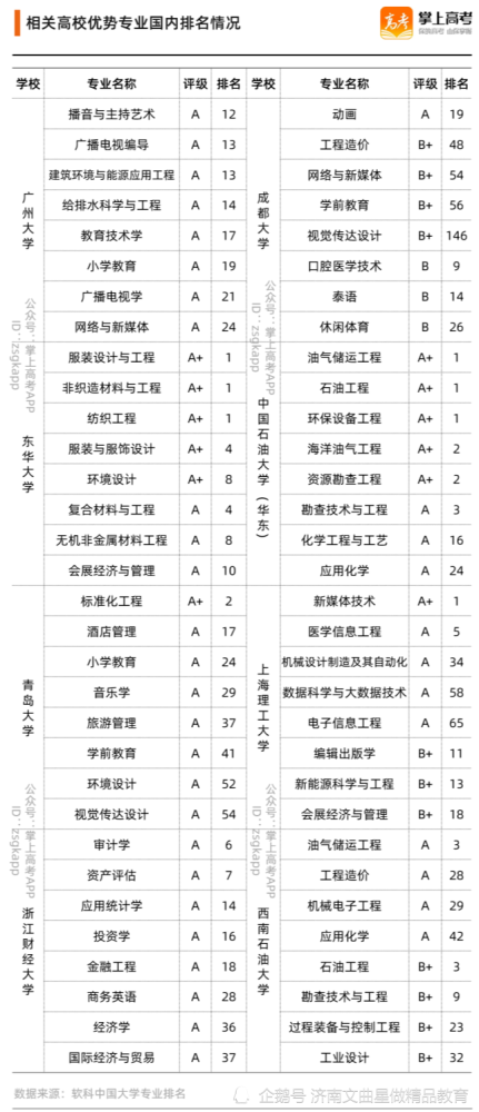 其中,东华大学的服装设计与工程、非织造材料与工程、纺织工程不仅是A+等级,更是均位列全国第1,非常符合“南有东华,北有北服”的行业领先地位。同样作为具有鲜明行业特色的中国石油大学(华东),油气储运工程、石油工程、环保设备工程也是A+等级,且位列全国第1,海洋油气工程、资源勘查工程在A+等级中位列全国第2,勘查技术与工程在A等级中位列全国第3。上海理工大学的新媒体技术专业除了是A+等级,同样位列全国第1。