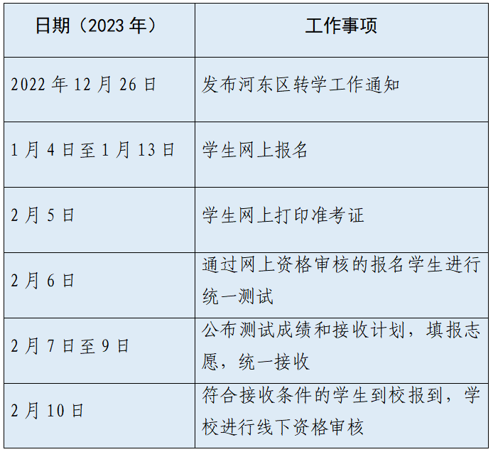1.网上报名。2023年1月3日至2023年1月13日,凡符合条件的学生,登录“河西区中学转学报名平台”(网址: http://zhx.tjhxec.cn),按照要求注册报名并上传相关材料。