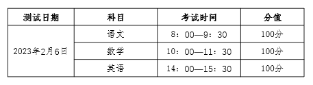 2023年2月6日 上午9:00—11:00 ?语文;2023年2月6日 下午13:30—15:00 数学、15:30—16:40 英语(不含听力)