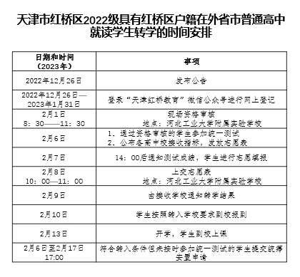根据《市教委关于做好具有天津市户籍在外省市普通高中就读学生转学工作的通知》要求,结合我区实际情况,现将2022级具有红桥区户籍在外省市普通高中就读学生转学工作的政策及安排公告如下。