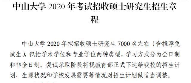 中山大学2020年拟招收硕士研究生7000名左右(含推荐免试生),包括学术学位和专业学位两种类型,学习方式分为全日制和非全日制。复试录取阶段将视教育部正式下达给我校的招生计划、生源状况和学校发展需要等情况对招生计划做适当调整。
