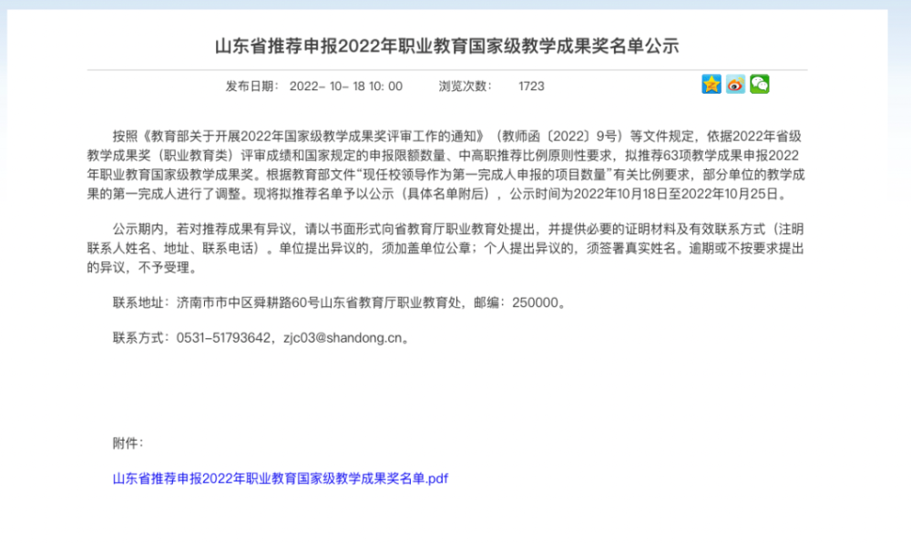 ●?山东省推荐申报2022年职业教育国家级教学成果奖名单公示