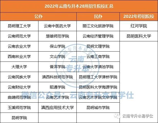 目前,整个云南省共有本科学校有32所,并且部分是既有本科专业又有专科专业。2022年云南共有28所普通高校参加专升本招生,其中共有19所公办院校,9所民办院校。
