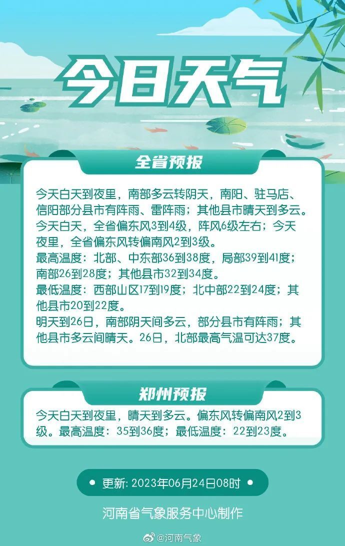 据@河南气象 预报,今天白天到夜里,南部多云转阴天,南阳、驻马店、信阳部分县市有阵雨、雷阵雨;其他县市晴天到多云。最高温度:北部、中东部36到38度,局部39到41度;南部26到28度;其他县市32到34度。最低温度:西部山区17到19度;北中部22到24度;其他县市20到22度。