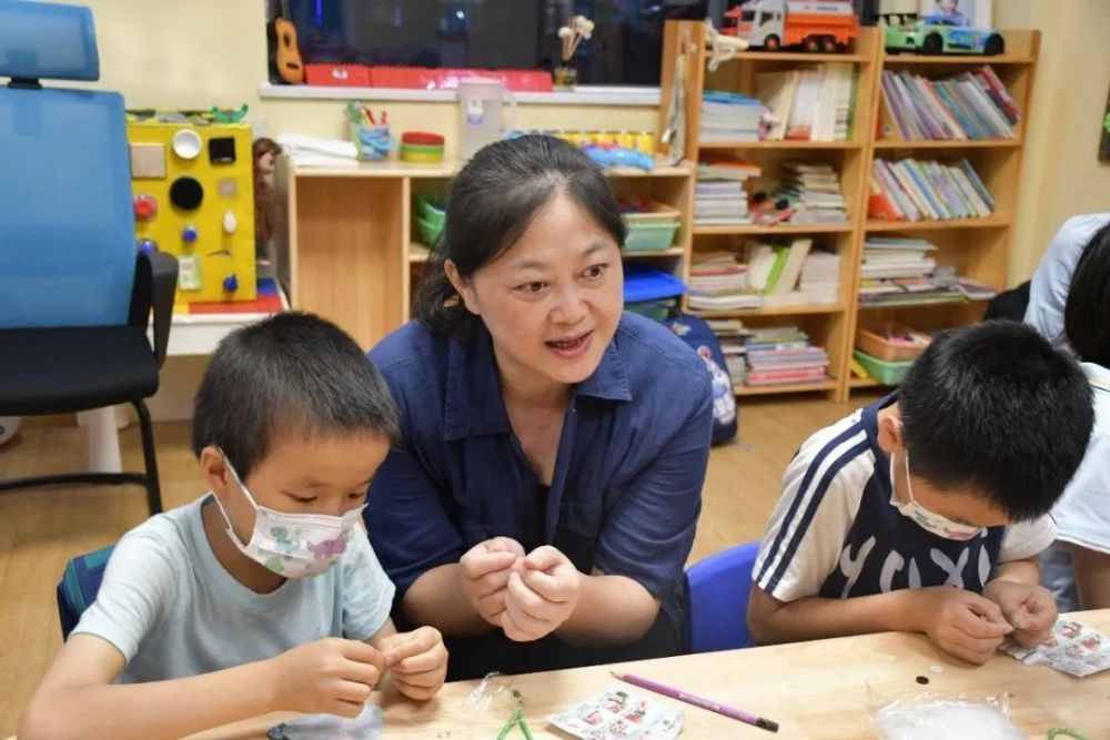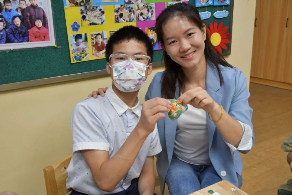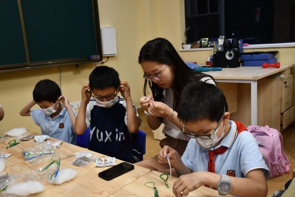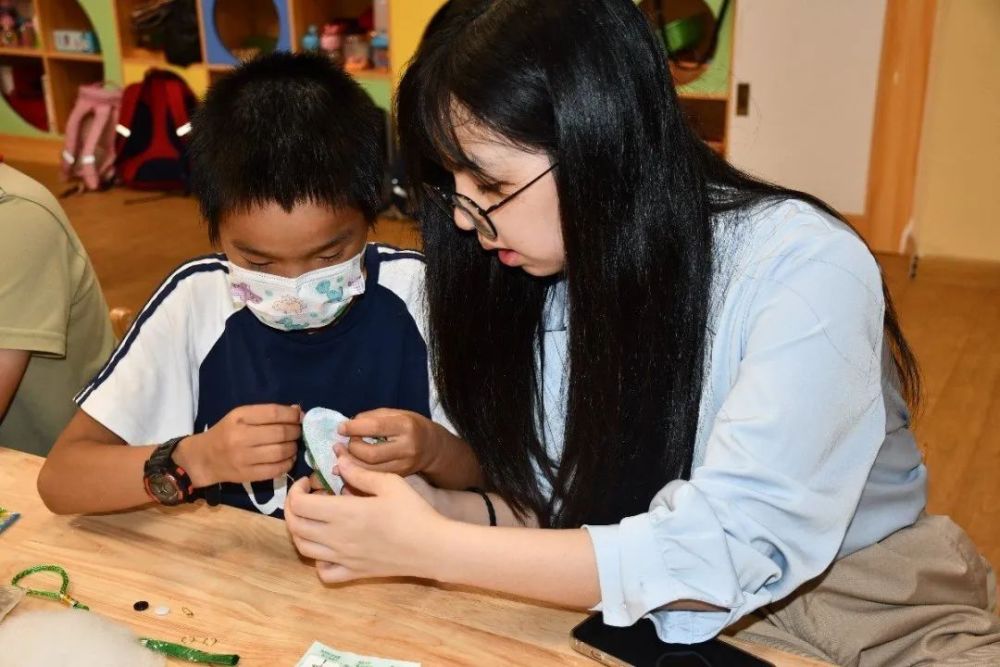 活动现场,教师们和第一福利院的儿童就着准备好的原材料,穿针引线、填充艾草香草……将香囊缝制成粽子的形状,再装上抽绳、吊珠和挂绳。大家一边耐心缝制,一边探讨交流,相互指导帮助,现场氛围热烈,忙得不亦乐乎。经过一个多小时的努力,一个个立体饱满又带有浓浓艾叶香味的端午节香囊就完成啦。看着自己亲手制作的香包,每个人的脸上都洋溢着笑容,非常有成就感。