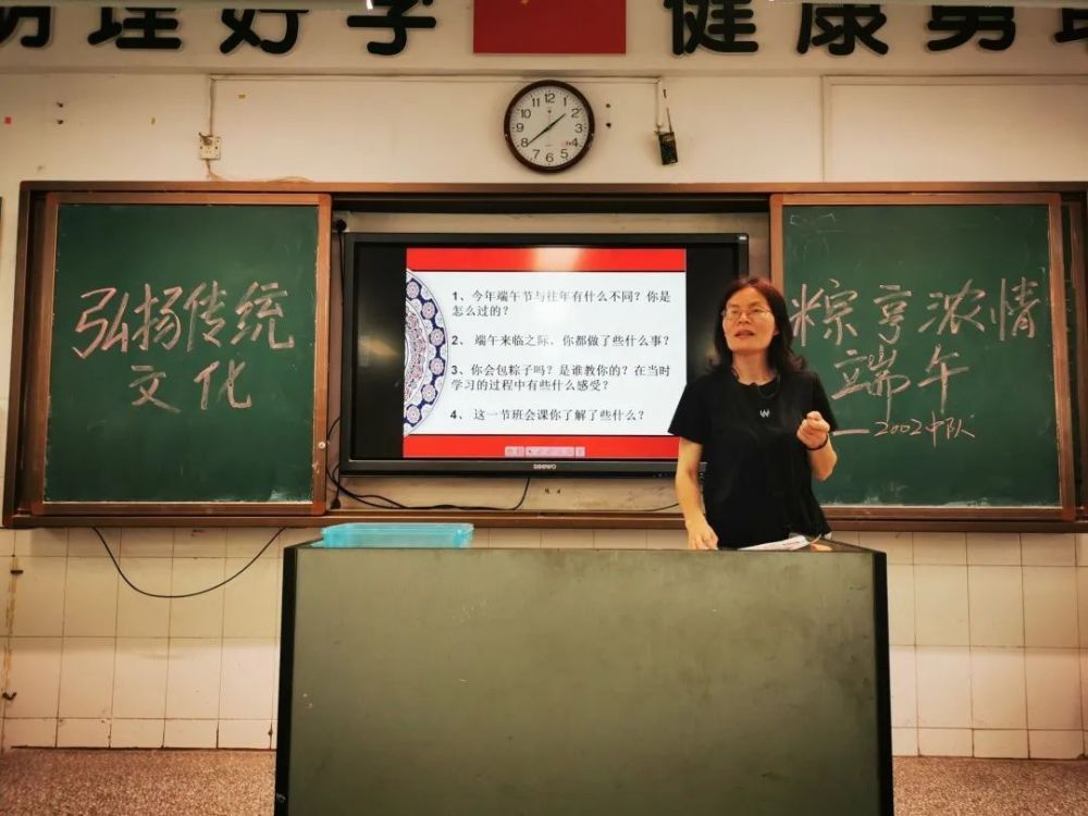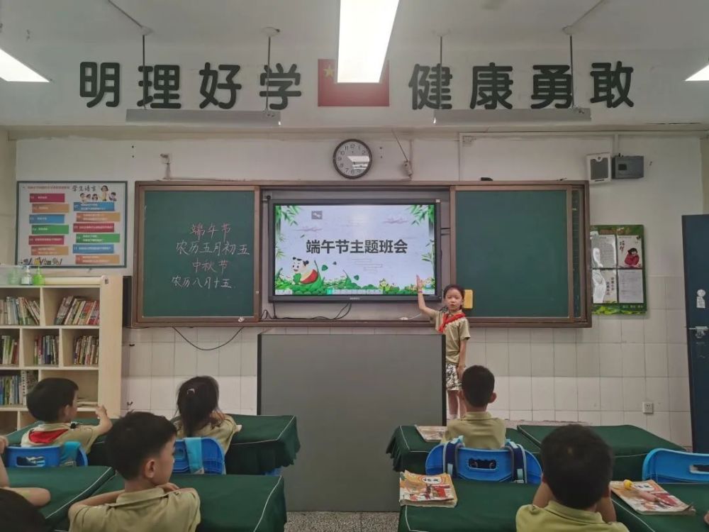 6月16日,班队会课上,各中队辅导员老师追溯了端午节的由来,给大家讲述了屈原的故事,孩子们一边观看视频一边听老师讲解,让学生明白端午节不只是粽子节、龙舟节,更是民族节、爱国节。老师们还向队员介绍了有关端午悬挂艾草、戴香包、长命缕、赛龙舟、吃粽子等各地不同的民族习俗。