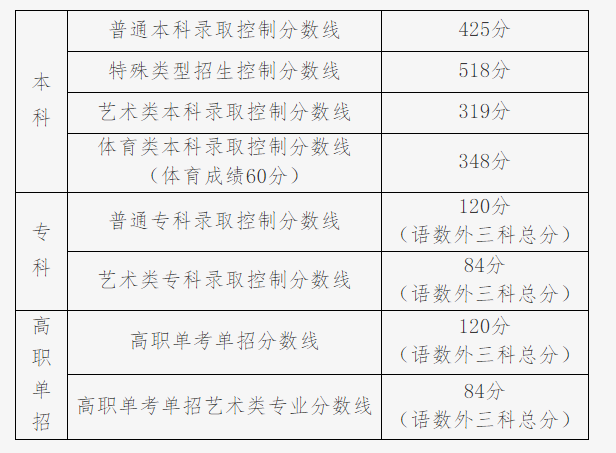 本科:425分、特殊类518分、专科120分。