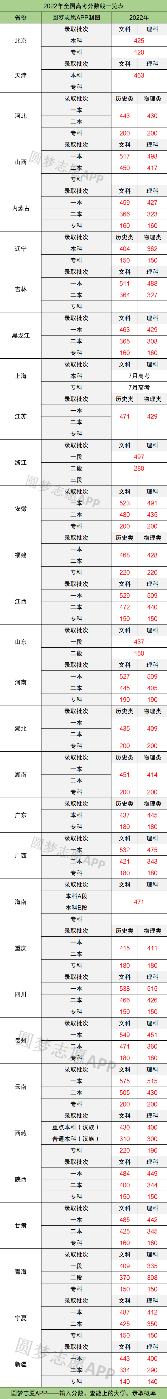 2022年全国各省高考分数线一览表