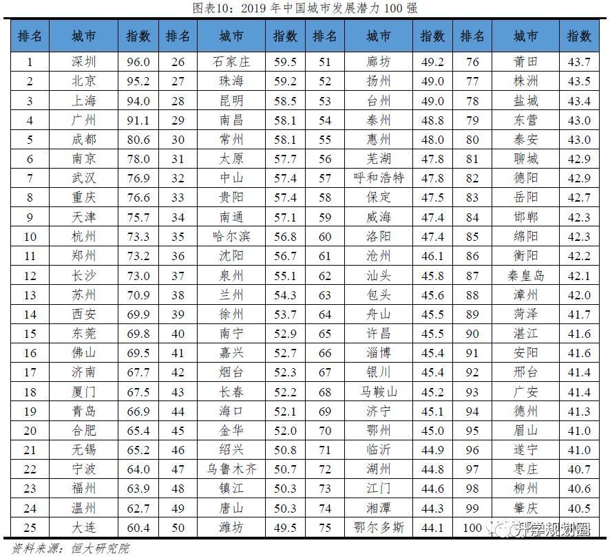 2019年深北上广稳居中长期发展潜力榜单前4名,二线城市中成都、南京、武汉、重庆、天津、杭州位居前十。
