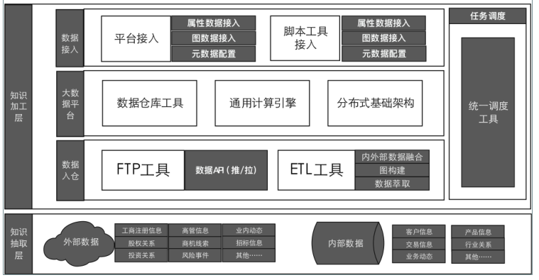 知识图谱整体架构按照数据流转方向自下而上包含数据源层、数据加工层、知识管理层、分析挖掘层、风险防控应用层和开放服务交互层。
