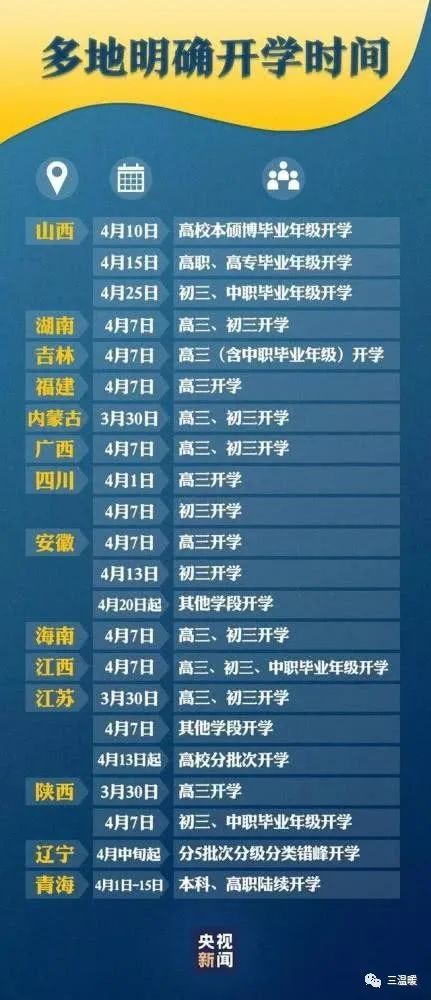 除了在三月份部分省份开学以外,以下统计了一些前期公布的4月份开学的省份(其中三个省份高三、初三年级3月30日开学),很明显这都是一些关键毕业年级段的开学信息,毕竟他们恢复开学已经到了刻不容缓的地步。