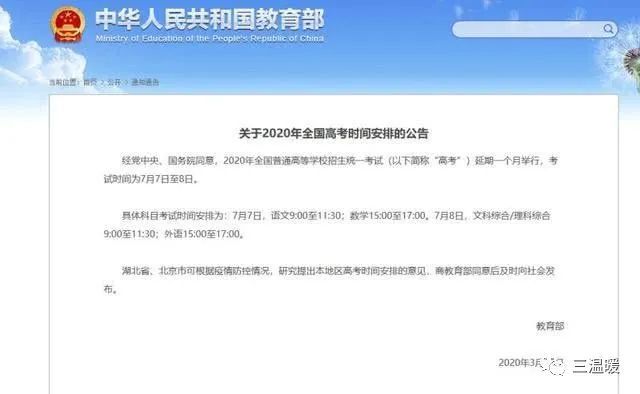 当然也不排除个别省市曾在上半年小学不开学的情况,早在3月底的时候,国家教育部公布了2020年高考延期一个月的通知,其中湖北省、北京市排除在外,要根据疫情情况另外考虑。