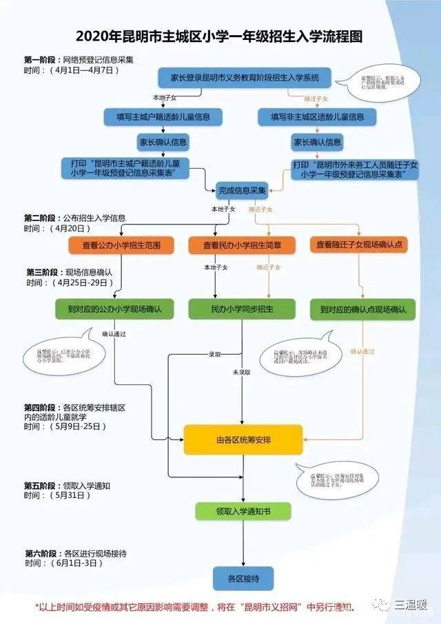 以下为云南昆明教育部门发布的小学一年级招生入学流程图: