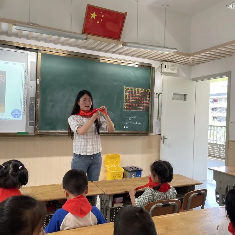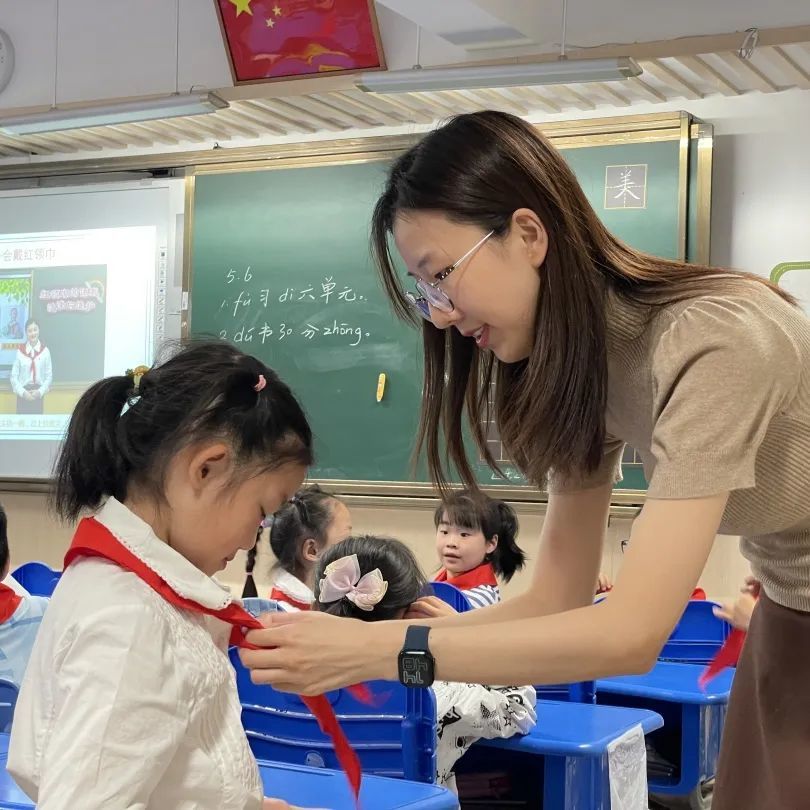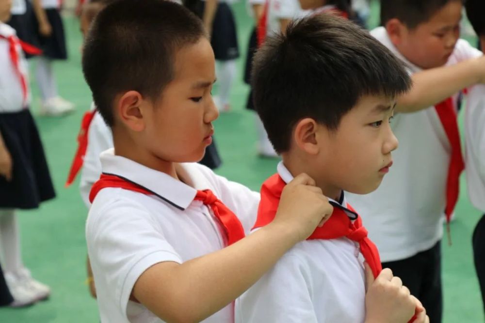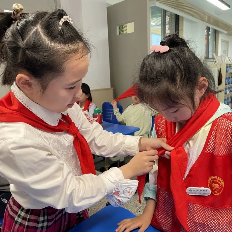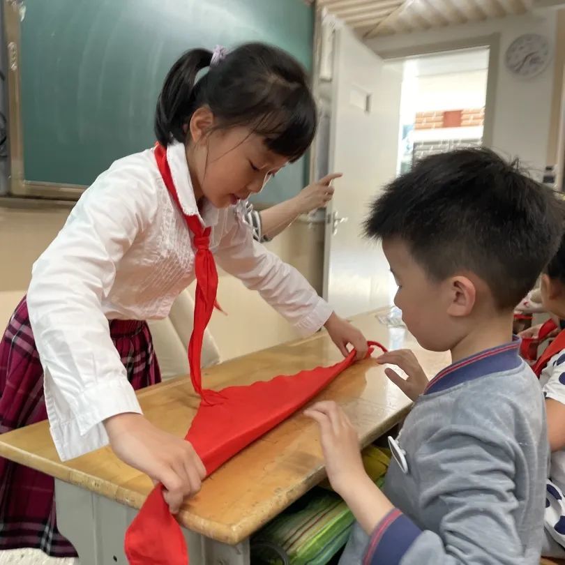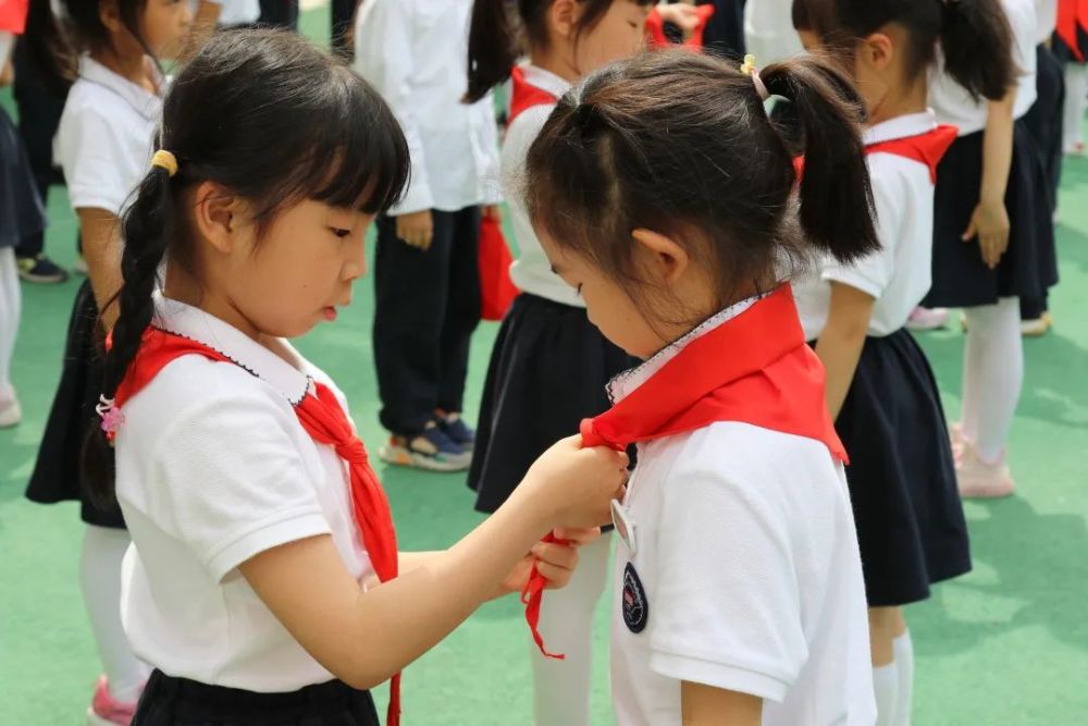 伴随着音乐《红领巾飘起来》,二年级少先队员代表为全体新队员佩戴红领巾,每一位小队员都十分认真。新老少先队员互敬队礼,鲜艳的红领巾映衬着队员们充满朝气的脸庞,这是一种精神的传承,更是发自内心的骄傲与自豪。
