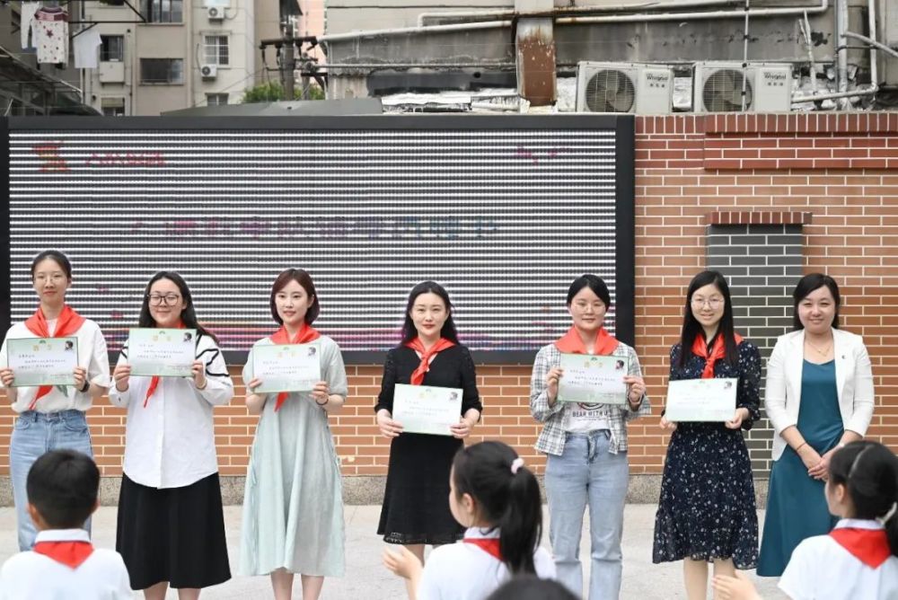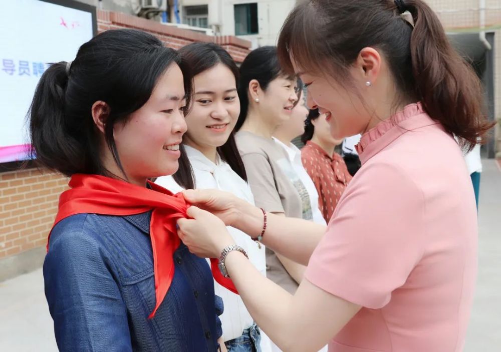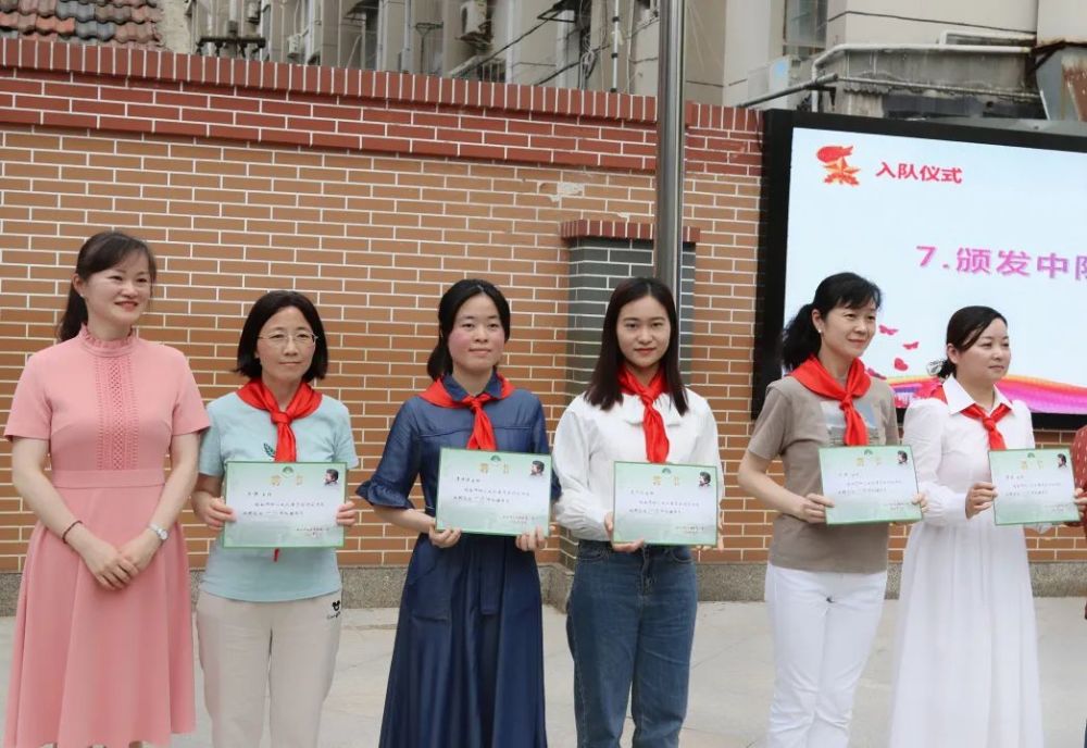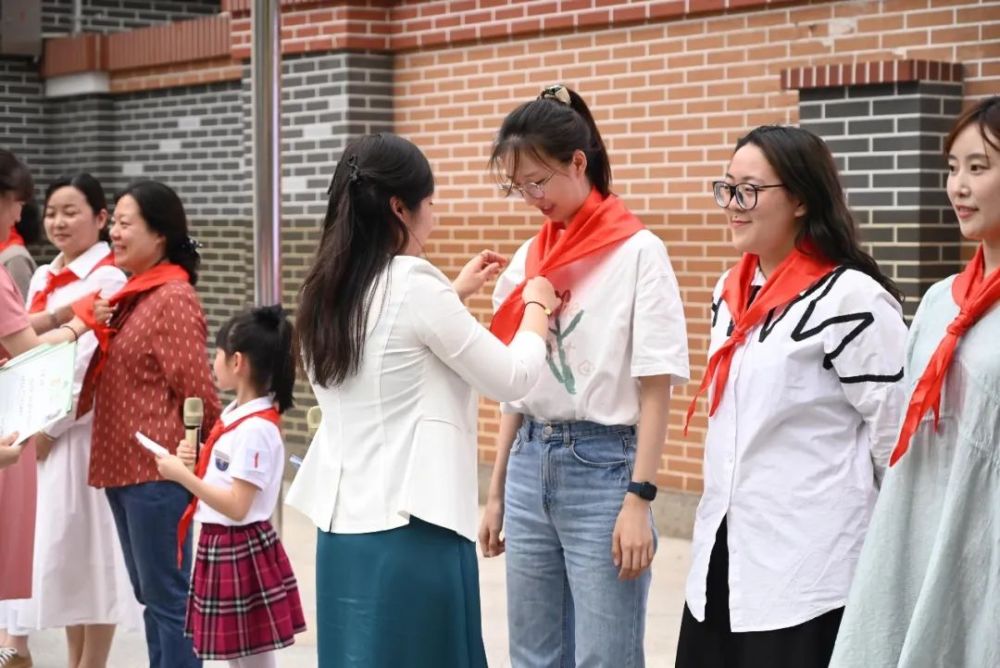 随后,在激昂的音乐中,郭静副校长和姚梅副校长为一年级新聘的中队辅导员颁发聘书,并授予红领巾。
