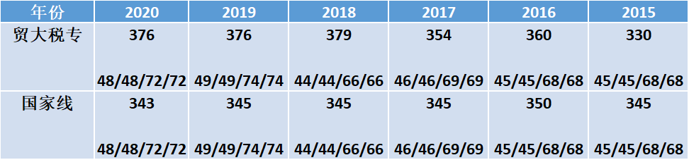 分数线,2018年的是379分,2019年是376分,2020年也是376分,这几年的分数线还是非常稳定的,基本上都是比国家线要高三四十分的。国家线是一个警戒线,单科一定要过线。贸大没有单独的对英语和专业课划线,它采用的都是国家线,除了特殊的几个英语口译、英语笔译可能是有单独划线。34所才有自主划线的权利。单科最起码考到50分以上,就可以不用担心单科不过线。