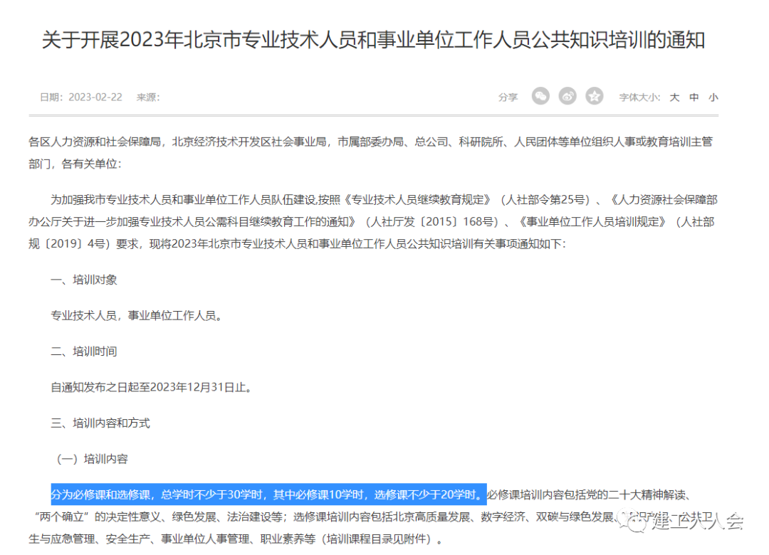 参考《关于开展2023年北京市专业技术人员和事业单位工作人员公共知识培训的通知》:培训内容 分为必修课和选修课,总学时不少于30学时,其中必修课10学时,选修课不少于20学时。