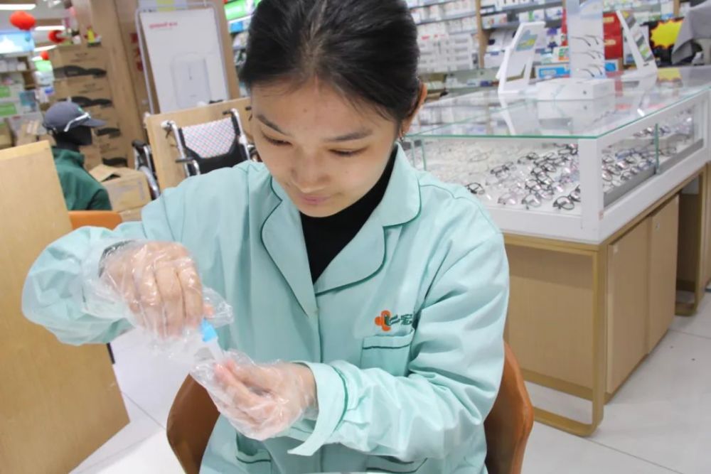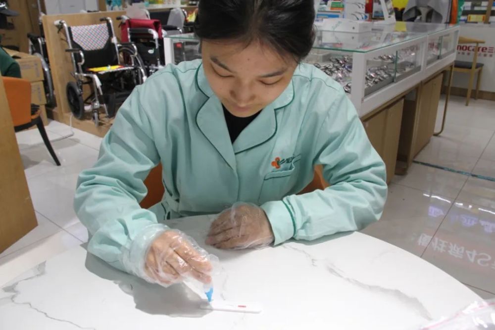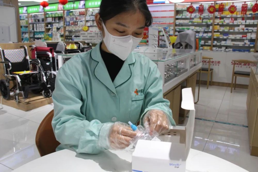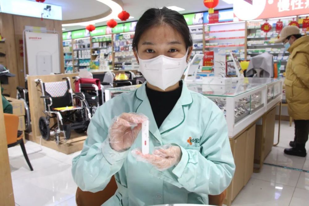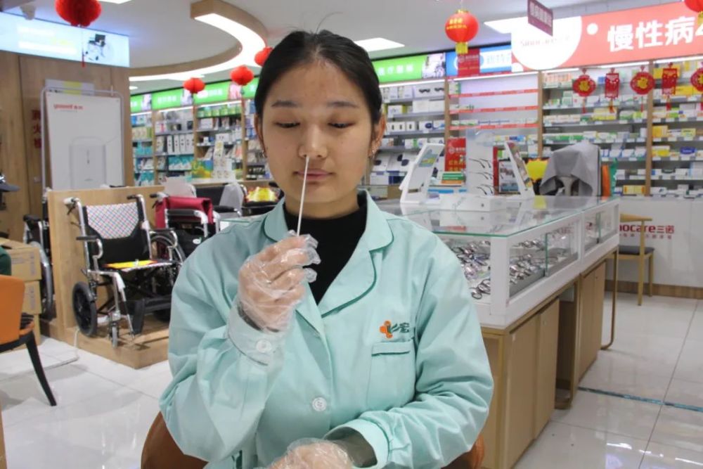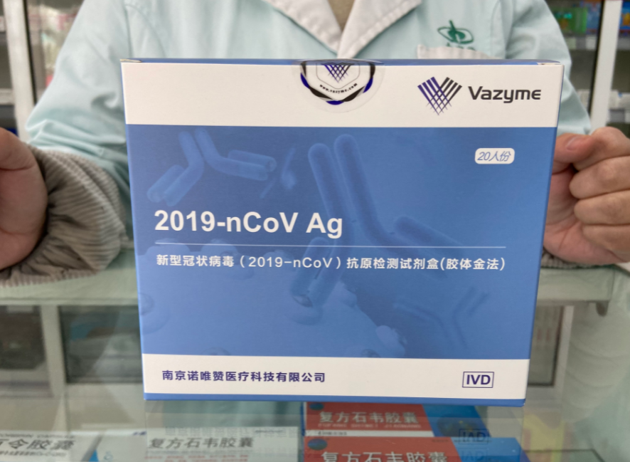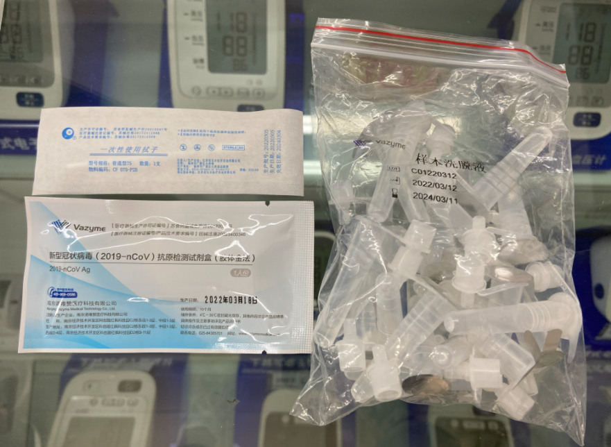 东方红路的百信缘大药房,店外张贴了“新冠检测试剂盒”宣传海报,记者测温、扫扬程码后,进入店内选购。该药房店长介绍,所售的新冠病毒抗原检测试剂盒,由南京诺唯赞医疗科技有限公司生产,采用“胶体金”新冠病毒抗体检测法,产品由“一次性使用拭子”、“样本洗脱剂”和“新型冠状病毒抗原检测试剂盒”三部分组成。
