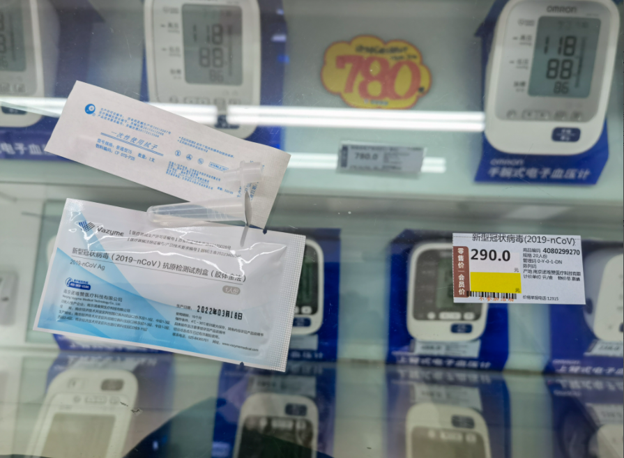东方红路众成堂医药也在售同款检测试剂盒,药店销售人员告诉记者,目前只有具有第三类医疗器械经营许可证的药房才有销售资格。购买抗原检测试剂盒,与购买发热退烧药品一样,需要扫码登记姓名、身份证号、现住地址、当前体温等个人信息,并通过扫电子监管码录入药品信息,可刷医保卡购买。