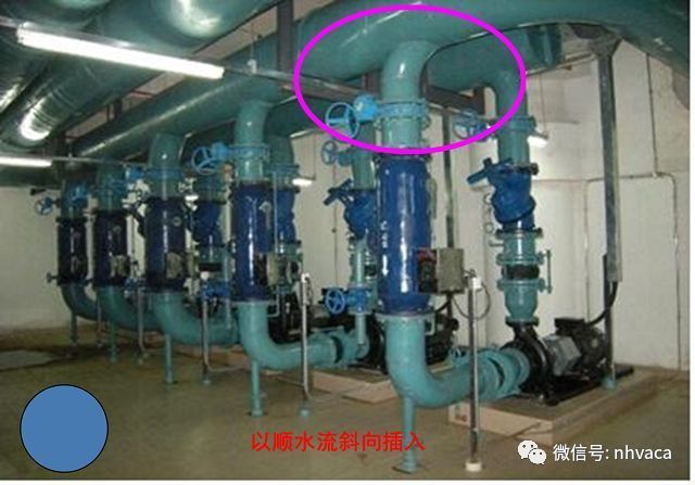 对于空调水系统,多台水泵出口支管接入总管常采用 T 形连接的的形式,修编组通过深入的讨论,总结工程实践中得到的经验,作出否定的规定,要求采用以顺水流斜向插入的形式。